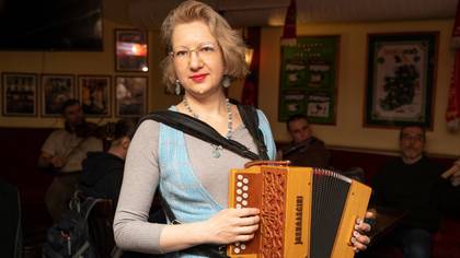 Соорганизатор вечеров музыки Лара Шу играет на необычном инструменте — ирландской гармошке. Она выступает на сейшенах вместе с другими артистами / Фото: Анна Темнышова / Вечерняя Москва
