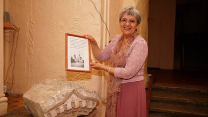Прихожанка храма святителя Николая в Новой Слободе Наталия Королева показывает фрагмент камня, украшенного резьбой. Раньше он был частью стены храма, который стоял на месте современной постройки в 1703–1712 годах / Фото: Екатерина Алексеева / Вечерняя Москва